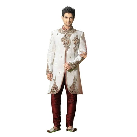 Fancy Off White Jacquard Silk Indian Wedding Sherwani For Men